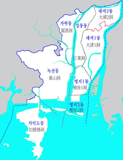엄궁동의 낙동강 건너편은 부산광역시 강서구이다. 낙동강의 동쪽의 강안에는 부산광역시 북구-사상구-사하구(다대포)이고, 낙동강 서쪽 지역이 강서구(江西區)이다. 다시 말하면 강서구는 화명생태공원 건너편 낙동강(강서구 대저수문)에서 갈라져 흐르는 서(西) 낙동강을 포함하고 있는 방대한 지역이다. 낙동강 하구 강서구와 사하구 사이의 삼각주 섬이 을숙도(사하구 하단1동)이다. 부산시 전체 면적의 23.2%를 차지하며 낙남정맥의 산들로 인해 서고동저(西高東低) 지형을 형성하고 있다. 본래 김해에 속했던 지역이나 1989년 부산직할시 북구와 의창군 일부 지역과 통폐합되어 강서구로 신설되었다. 소위 김해평야로 알려진 한국 최대의 삼각주로 벼농사가 활발하였다. 그러나 최근에는 산업단지들이 들어서 곳곳에 공장이 들어서고 도로가 건설되어 있다.