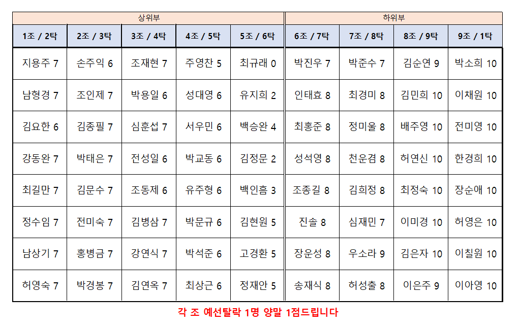 각 조 예선 탈락 1명 양말 1점 증정