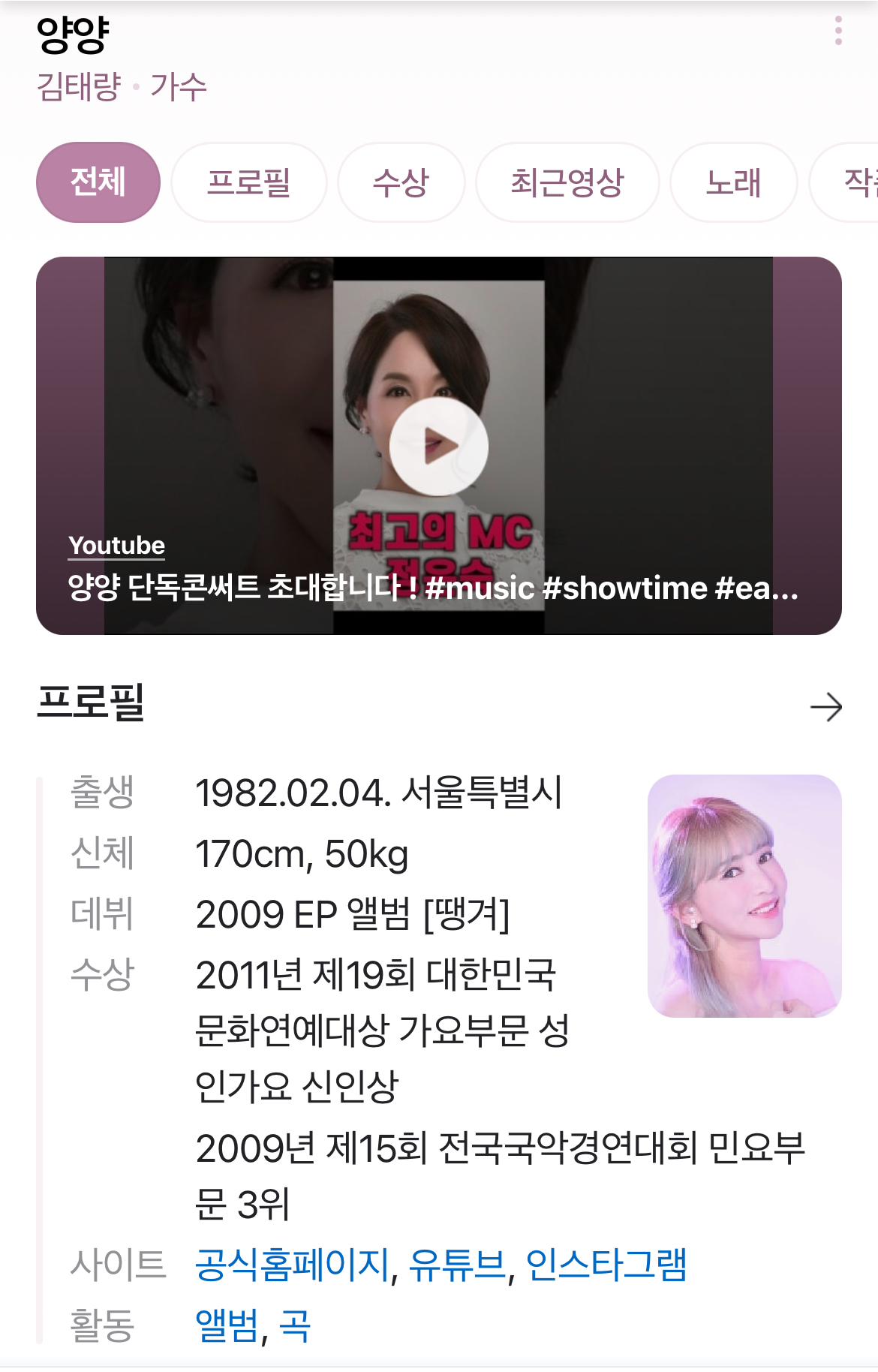 네이버에 가수 양양 치시면 양양님 프로필에 나오는