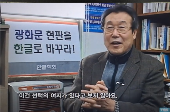 10년 전 한글현판 달기 국민대회를 열었을 때 한 방송 인터뷰에서 "광화문에 걸린 한자현판을 떼고 한글현판을 달면 자주문화강국이 된다"라고 말하는 한말글문화협회 리대로 대표 모습.