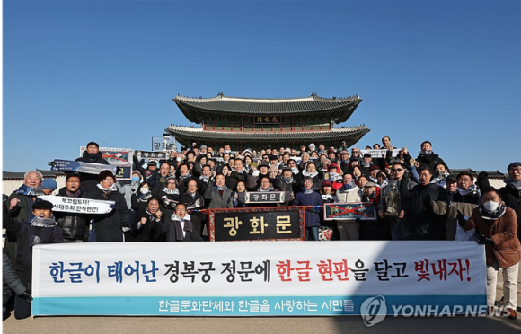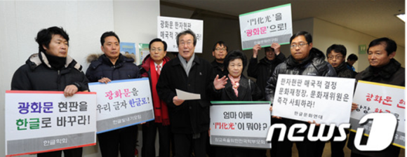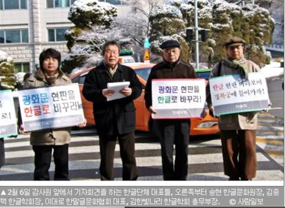 우리는 나라 얼굴인 광화문에 중국 속국 상징이 한자 복제현판을 그대로 둘 수 없어 지난해 12월 28일 훈민정음 창제 기념일을 맞이해 한글단체와 시민단체, 재외동포들까지 200여 면이 참여해 광화문 한글현판달기 세계시민 대회도 열었다.