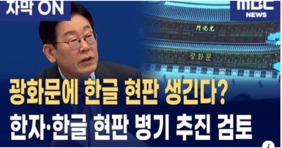 지난 1월 20일 청와대 세종실에서 열린 국무회의에서 최휘영 문체부장관이 이재명 대통령에게 ”광화문에 한자현판과 함께 한글현판을 달 것을 추진하겠다고 보고하고 허민 국가유산청도 동의한다. “라고 말했다. 그리고 한글학회(회장 김주원)를 비롯한 한글단체와 전직 국회의원들 모임인 헌정회(회장 정대철)는 ”국민화합과 한글을 빛내어 자주문화를 꽃피우고 민족정기를 일으키자“라는 차원에서 문체부장관 제안을 환영한다는 뜻을 밝혔다. 나도 고민 끝에 이 문체부 제안을 받아들였다.