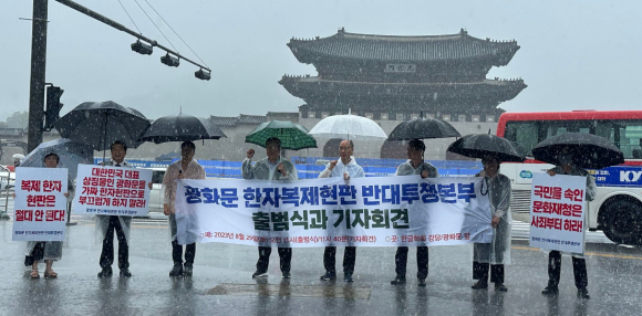 한글학회 회장 김주원과 강병인, 고형회, 리대로,안철주, 김들풀, 김한빛나리 들은 3년 전 8월 29일 국치일에 비가 세차게 내리는 날에도 우리는 광화문 앞에서 한자복제현판 반대 투쟁본구 출범식 기자회견을 했지만 언론은 하나도 보도하지 않았다.