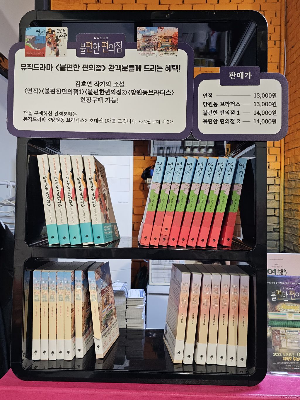 공연장 로비에 불편한 편의점 1ㆍ2권, 연적, 망원동 브라더스 책도 판매를 하고 있다