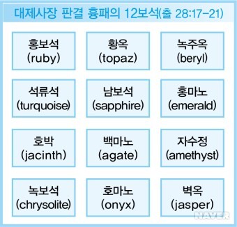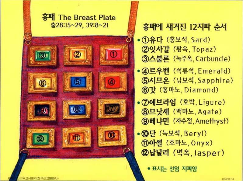 대제사장이 직무를 수행할 때 가슴에 다는 패(출 28:15). 가로 세로 한 뼘의 정사각형으로 12지파의 이름이 새겨진 12보석이 달려 있었고, 두 겹으로 된 안쪽 주머니에는 ‘우림과 둠밈’이라는 성물이 있어 중대한 판결을 내릴 때 하나님의 뜻을 묻는 제비 뽑기 도구로 사용되었다.