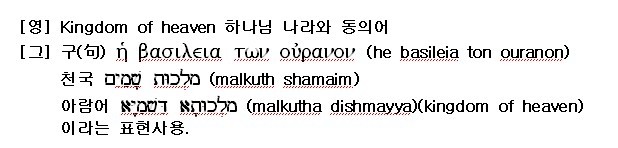 [영] Kingdom of heaven 하나님 나라와 동의어. 마태복음에만 씌어져 있는 말로서 다른 복음에서는 [하나님 나라] 즉 하나님께서 통치하시는 나라를 말하고 있다. 이것은 종말적인 의미를 가지고 있는 말로서(마 3:2,4:17,5:3,10,19,20 7:21, 8:11, 10:7,11:11, 12, 13:11, 24:31, 33, 44, 45, 47, 52, 16:19, 18:1, 3, 4, 23, 19:12, 14, 23, 20:1, 22:2,23:13, 25:1), 하나님의 이름을 부르기를 주저한 유대인의 감정을 고려하여, [하나님] 대신에 [하늘]이라는 말의 [천국]을 쓴 것으로 해석되고 있다(마 12:28,19:24,31:43등에는 [하나님 나라]를 쓰고 있다). 후기 유대교에서는 [하나님] 대신에 [하늘]을 쓰는 경향이 생겨나, 메시아의 지배 및 그 나라에 대하여 [천국 (malkuth shamaim)] [아람어] (malkutha dishmayya)(kingdom of heaven)]이라는 표현을 썼다. 유대인을 대상으로 하여 기록된 마태복음이고 보면, 이 점을 고려하여 [천국]이라는 표현을 썼을 것은 쉽게 이해가 가는 일이다. 그리스도교에서 일반적으로 말하는 [천국]은 주로 피안의 세계에 있어서의 축복된 장소를 의미하고 성서의 [하나님 나라=천국]에 포함되는 일부이다.→하나님 나라