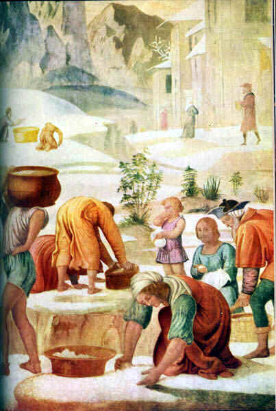 이스라엘인들이 황야에서 만나를 주어 모으고 있는 구도(構圖)는 최후의 만찬의 그림에 대응하는 취급을 받아서, 이들 구도를 조합하여 그려진 것이 있다. 더크 바우츠(Dirk Bouts, 1415-1475)의 『최후의 만찬』3연제단화(三連祭壇畵)(1468), 루벤(베르기)에 있다. 틴토레토(Tintoretto, 1518-1594)의 작품으로 『만나』(1592), 베네치아(이탈리아)도 알려져 있다. (출처:인터넷)