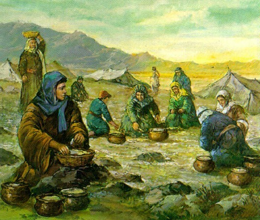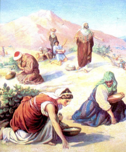 광야생활로 음식물이 부족하여 신광야에서 이스라엘 백성이 불평원망하고 있는 때, 그것은 하나님으로부터 두달 반되는 때부터 처음으로 주어졌다. 그것은 하늘로부터 비같이 내린 양식이었다(출 16:4). 깟씨 같고도 희고 맛은 꿀섞은 과자 같았다(출16:31,민 11:8).