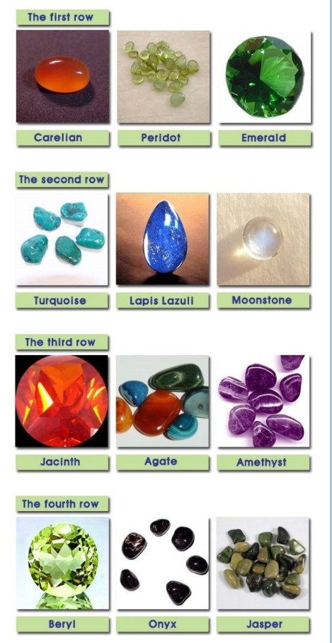 네 줄로 보석을 박았는데 12보석이 3개씩 4열로 있었다(39:10-13). 12개의 보석에는