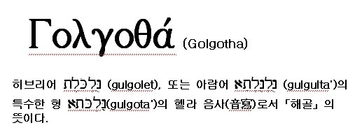 gulgota')를 헬라어(고대 그리스어)의 음으로 번역한 명칭으로‘해골’을 의미함.