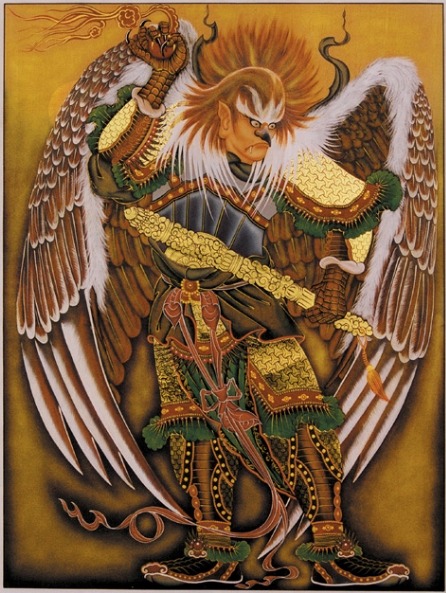 날개가 돋친 모습으로 그려져 있다. 이칭 금시조(金翅鳥), 수파르나(Suparna)