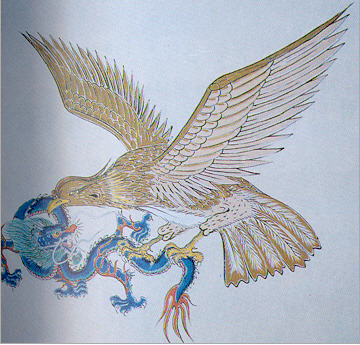 가루라(迦樓羅). 인도(印度) 사람이 상징하는 큰 새로 용(龍)을 잡아먹는다 함.