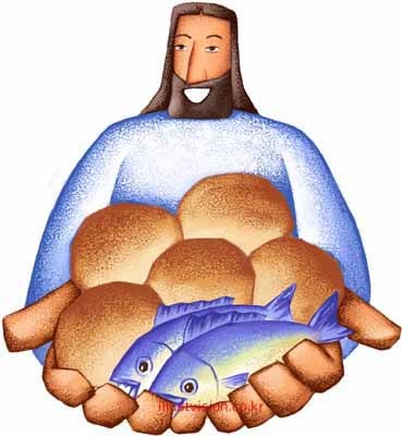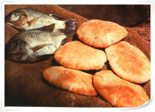 19 무리를 명하여 잔디 위에 앉히시고 떡 다섯 개와 물고기 두 마리를 가지사
