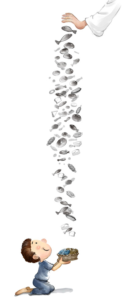 9 여기 한 아이가 있어 보리떡 다섯 개와 물고기 두 마리를 가지고 있나이다 그러나
