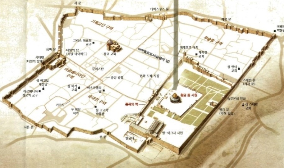 (Zion Gate)이, 그리고 서쪽에 욥바 문(Joppa Gate)이 있다.