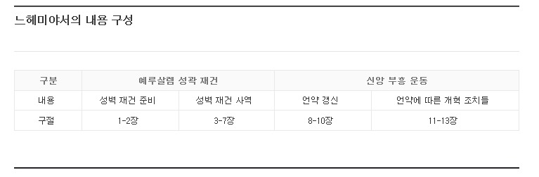 본서는 3차 포로 귀환의 인솔자인 느헤미야가 귀환한 유다 백성과 더불어