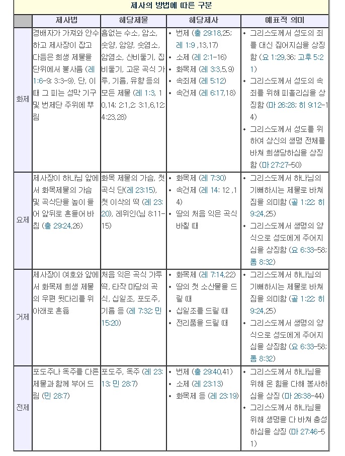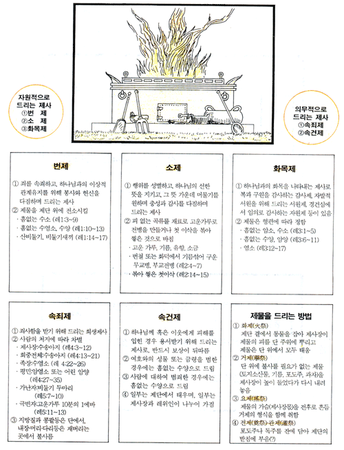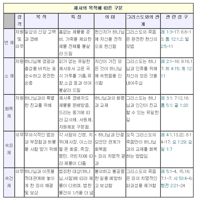 1. 제사 목적에 따른 분류 : 번제, 소제, 화목제, 속죄제, 속건제