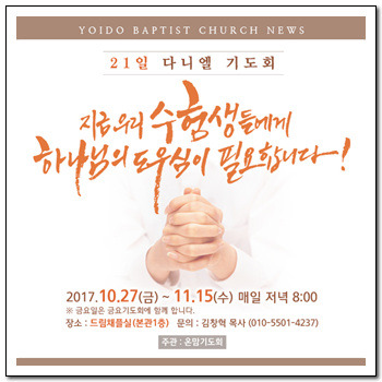 • 일시 : 10월 27일(금)부터 21일간 진행, 매일 저녁 8시 (금요일은 금요기도회와 함께합니다.)