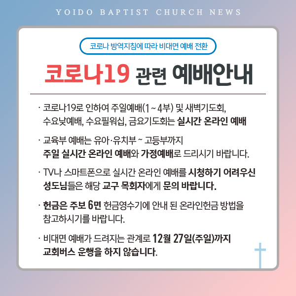 코로나19 관련 정부방역조치가 2.5단계로 격상됨에 따라 모든 예배는 오늘(8일)부터 비대면(실시간 온라인)예배로 진행됩니다.