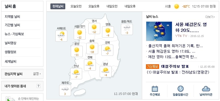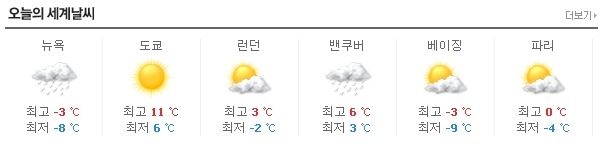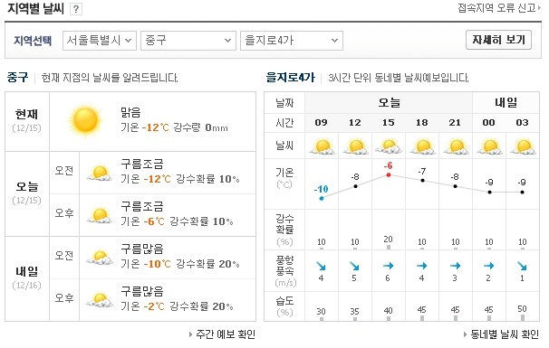 네이버 날씨정보 : 오늘의 날씨, 생활정보, 세계의 날씨 작성자안현상|작성시간10.12.15|조회수1,311 목록 댓글 0 글자크기 작게가 글자크기 크게가 네이버 날씨정보 - 오늘의 날씨 : 지역(동네별) 날씨 정보 - 생활정보 - 세계의 날씨 ☞ 네이버 날씨정보 사이트 바로가기 (클릭) http://weather.naver.com/ 다음검색 현재 게시글 추가 기능 열기 북마크 공유하기 신고 센터로 신고 댓글 댓글 0 댓글쓰기 답글쓰기 댓글 리스트