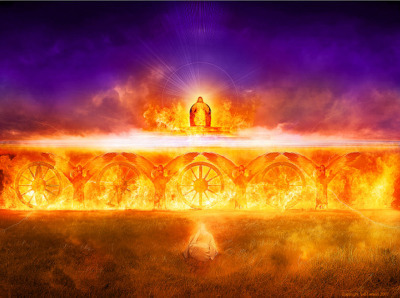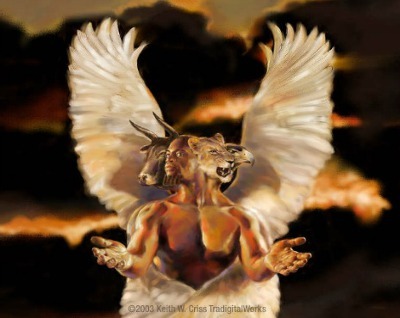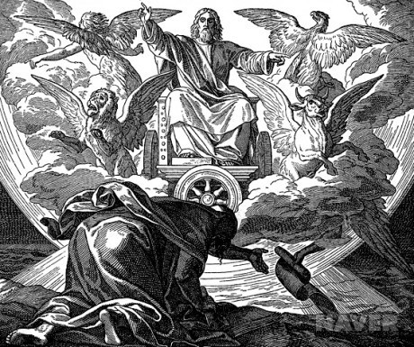 그 생물들은 각각 네 얼굴과 네 날개를 가졌고, 그들의 위에는 신의 옥좌가 빛나고 있다.