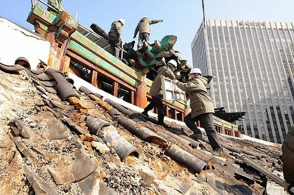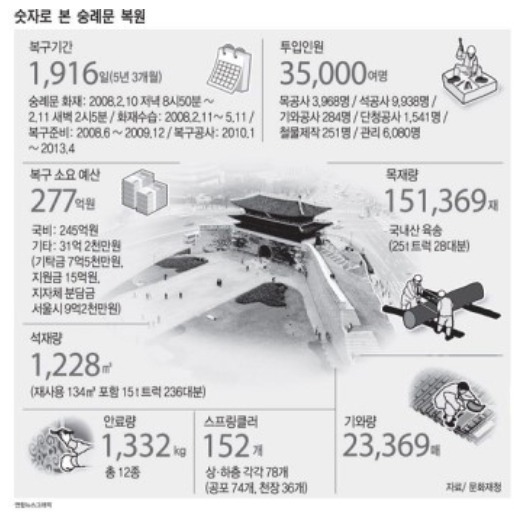 화재로 소실된 남대문 복원-다시 드러난 숭례문의 아름다운 자태 : 복구기간 5년3개월 총공사비 277억원, 연인원 35,000명 동원