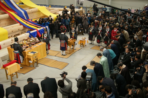 조선초 처음 세울때와 같은 전통기구와 전통기법으로 복원