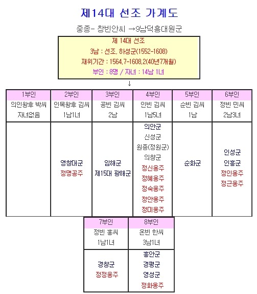 선조는 의인왕후를 비롯해 총 8명의 부인을 두었으며, 그들에게서 14남