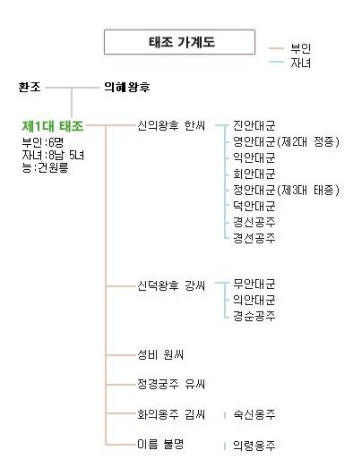 태조는 부인 3명에게서 8남 5녀의 자녀를 두었다.