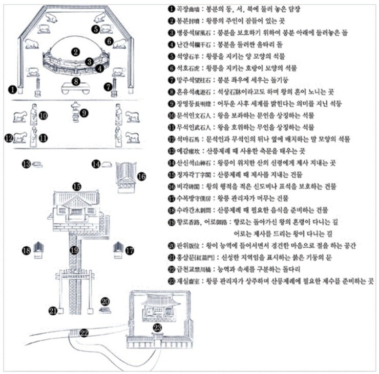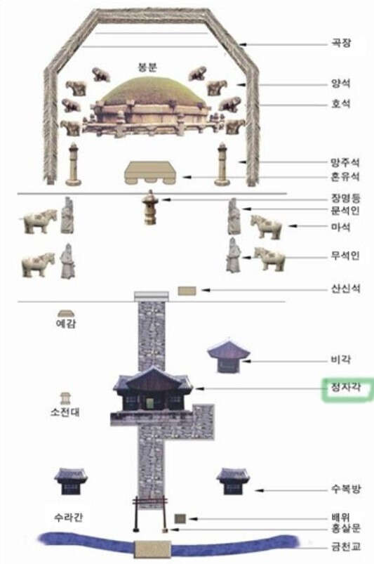 배치한 석물들도 조금씩 차이가 있으며, 금천교, 홍살문, 수라간, 수복방, 비각, 정자각, 예감 등도 형식이 매우 다양하다.