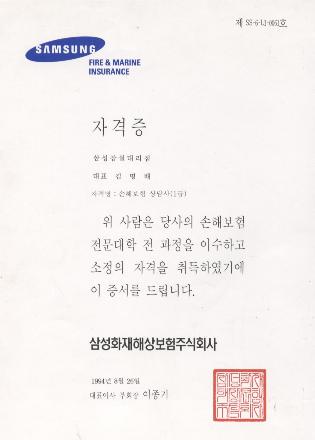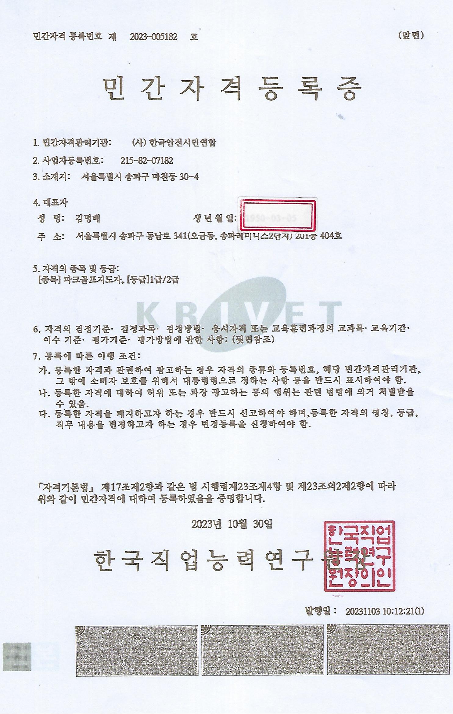 손해보험전문대학졸업 1급 상담사/국민안전관리사 1급 강사/한국파크골프지도자 1급 강사