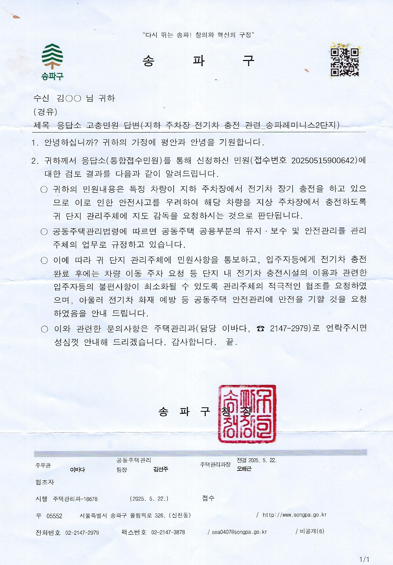 송파구청 의회에 송파구 안전입법조례 제안 검토중(아파트단지내 체육시설 런닝머신 안전관리자 의무채용 지하주차장에 자동차전기충전시설을 지상으로 이전설치)