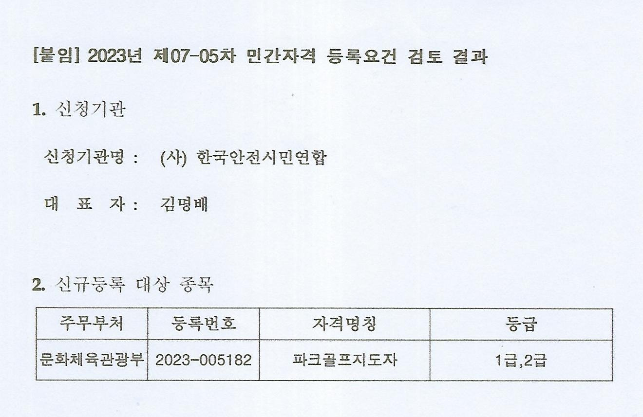 1. 문화체육관광부 승인등록 NO 2023~005182 파크골프지도자 자격증 < 파크골프. 건강. 안전 > 대한민국 유일한 골프,안전전문가 특별강사 교육실시 (사)한국파크골프연합회 파크골프지도자 1급, 2급 발급