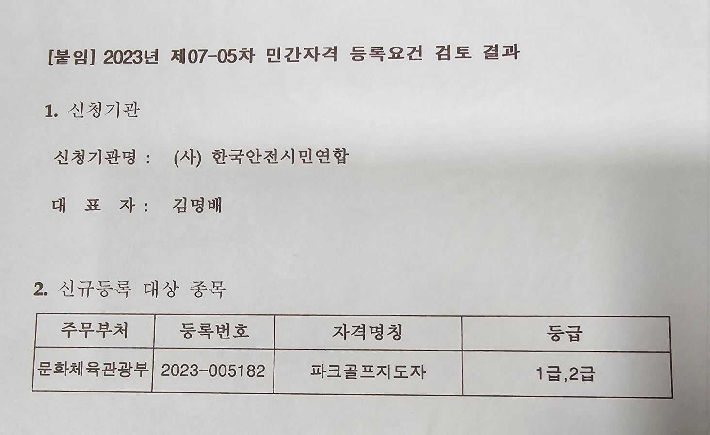 2023 11 01 문화제육관광부 승인등록 23-005182 사단법인 한국파크골프연합회는 대한민국의 최고의 지도자 합격을 실시합니다