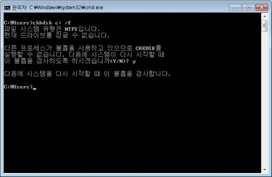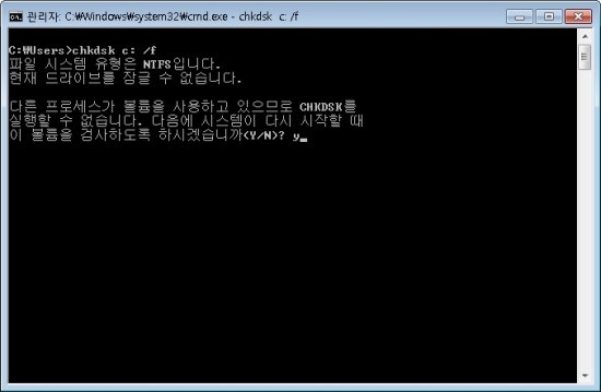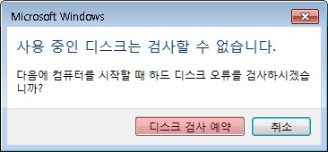 시스템이 다시 시작할 때 체크디스크를 실행할 것인지 묻습니다.