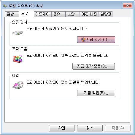 체크디스크 실행 방법 1. 디스크 속성의 "도구"메뉴 이용하기