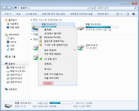 윈도우 탐색기 실행 -> C드라이브 마우스 우 클릭 -> 속성 클릭