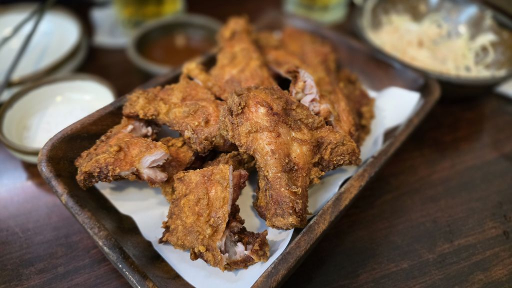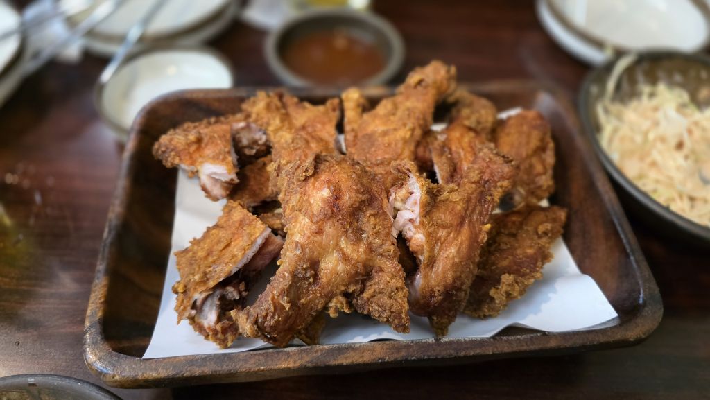튀김옷이 얇고 바삭하게 튀긴 치킨.