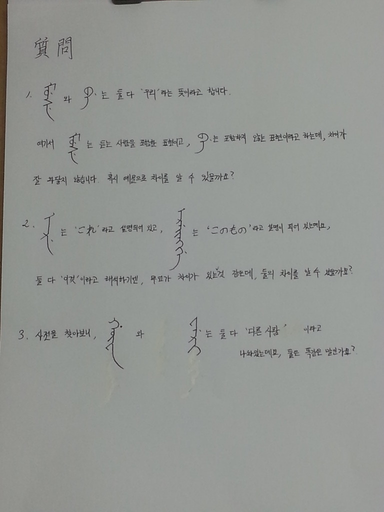 대명사를 공부하다가 몇 가지 의문점이 생겨서 질문드립니다.^^ 만주문자도 있고 해서 직접 써서 올립니다.