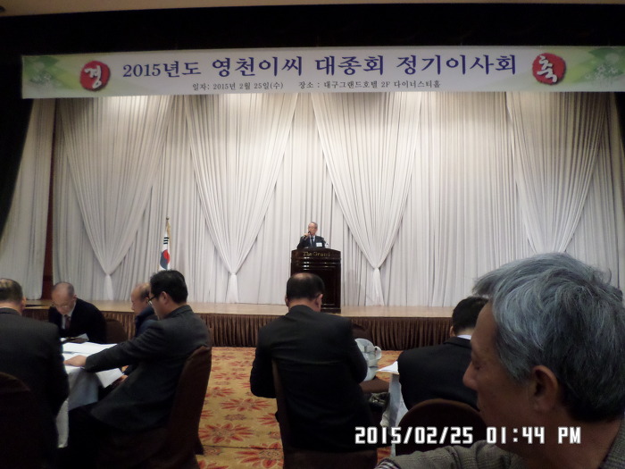 2015년 02월 25일 대구 그랜드호텔에서 많은 이사님이 참석하시어 다양한 의견을 주시고 성황리에 이사회가 진행 되었지만 의안들이 의결되지 못하고 종회하게 되어 매우 아쉬움이 있었습니다.제5호의안 고을회관 소유권 이전등기의 건은 대종회 명의로 이전등기 함이 맞다고 생각 되어집니다 제단을 설립할때 전임 이재태 회장님이 중심이 되어 많은 우리 종중원이 헌성금을 내시고 특히 野村 泰英 원로께서 거금을 헌성하시어 모든 종중원이 한마음 한뜻이 되어 건립한 위대한 업적이라 사료 됩니다.이럴진데 이는 마땅히 대종회의 명의로 이전 등기함이 맞으며 세월이 흘러가면 어떻한 변화가 있을지도 모르는 일입니다.그날 의견 중에 시조공이 먼저지 대종회가 먼저냐?는것은 본질적으로 다르다고 생각합니다 시조공은 우리 영천이씨의 시조공이시며 대종회는 우리 영천이씨의 최고 상위의 기관입니다 그러므로 시조공제단보존회가 상위가 아니고 당연히 모든 회는 대종회의 산하 단체라고 사료 됩니다.