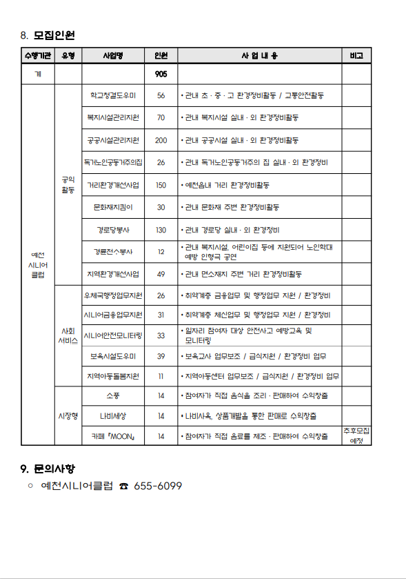 2022년 노인일자리 및 사회활동지원사업 참여자 모집공고 작성자예천시니어클럽|작성시간21.11.26|조회수473 목록 댓글 0 글자크기 작게가 글자크기 크게가 2022년도 참여자 모집공고(PDF 변환용).pdf60.89KB 첨부파일첨부된 파일이 4개 있습니다. png 파일 image.png 다운로드 png 파일 image.png 다운로드 png 파일 image.png 다운로드 pdf 파일 2022년도 참여자 모집공고(PDF 변환용).pdf 다운로드 다음검색 현재 게시글 추가 기능 열기 북마크 공유하기 신고 센터로 신고 댓글 댓글 0 댓글쓰기 답글쓰기 댓글 리스트
