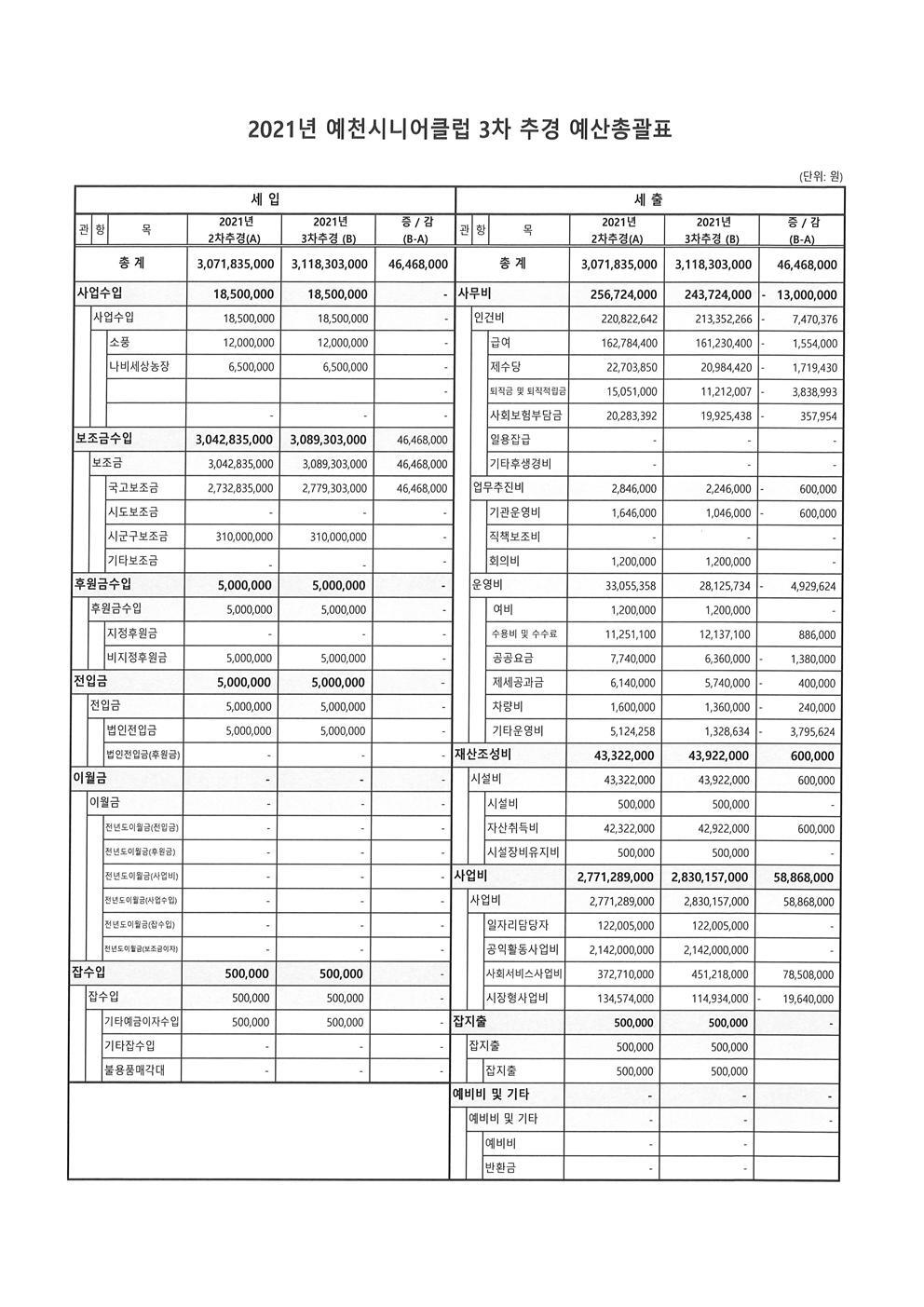 2021년 예천시니어클럽 3차 추가경정예산안 공고 작성자예천시니어클럽|작성시간21.12.08|조회수286 목록 댓글 0 글자크기 작게가 글자크기 크게가 다음검색 현재 게시글 추가 기능 열기 북마크 공유하기 신고 센터로 신고 댓글 댓글 0 댓글쓰기 답글쓰기 댓글 리스트
