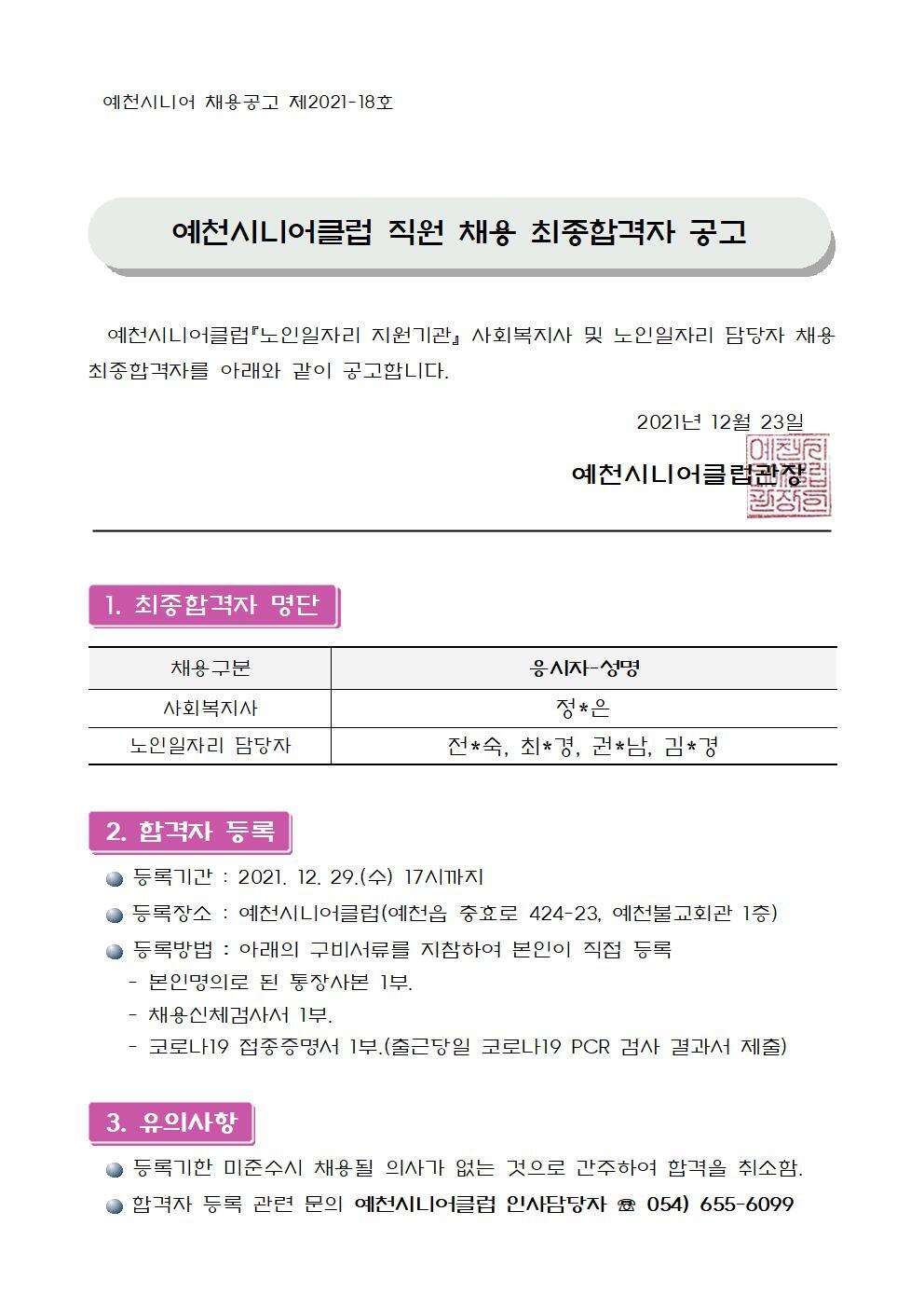 예천시니어클럽 직원(사회복지사 및 노인일자리담당자) 채용 최종합격자 공고 작성자예천시니어클럽|작성시간21.12.23|조회수577 목록 댓글 0 글자크기 작게가 글자크기 크게가 다음검색 현재 게시글 추가 기능 열기 북마크 공유하기 신고 센터로 신고 댓글 댓글 0 댓글쓰기 답글쓰기 댓글 리스트