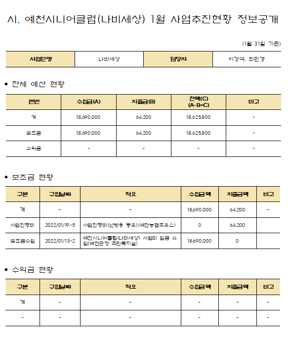 시. 예천시니어클럽(나비세상) 1월 사업추진현황 정보공개 작성자예천시니어클럽|작성시간22.02.18|조회수219 목록 댓글 0 글자크기 작게가 글자크기 크게가 다음검색 현재 게시글 추가 기능 열기 북마크 공유하기 신고 센터로 신고 댓글 댓글 0 댓글쓰기 답글쓰기 댓글 리스트