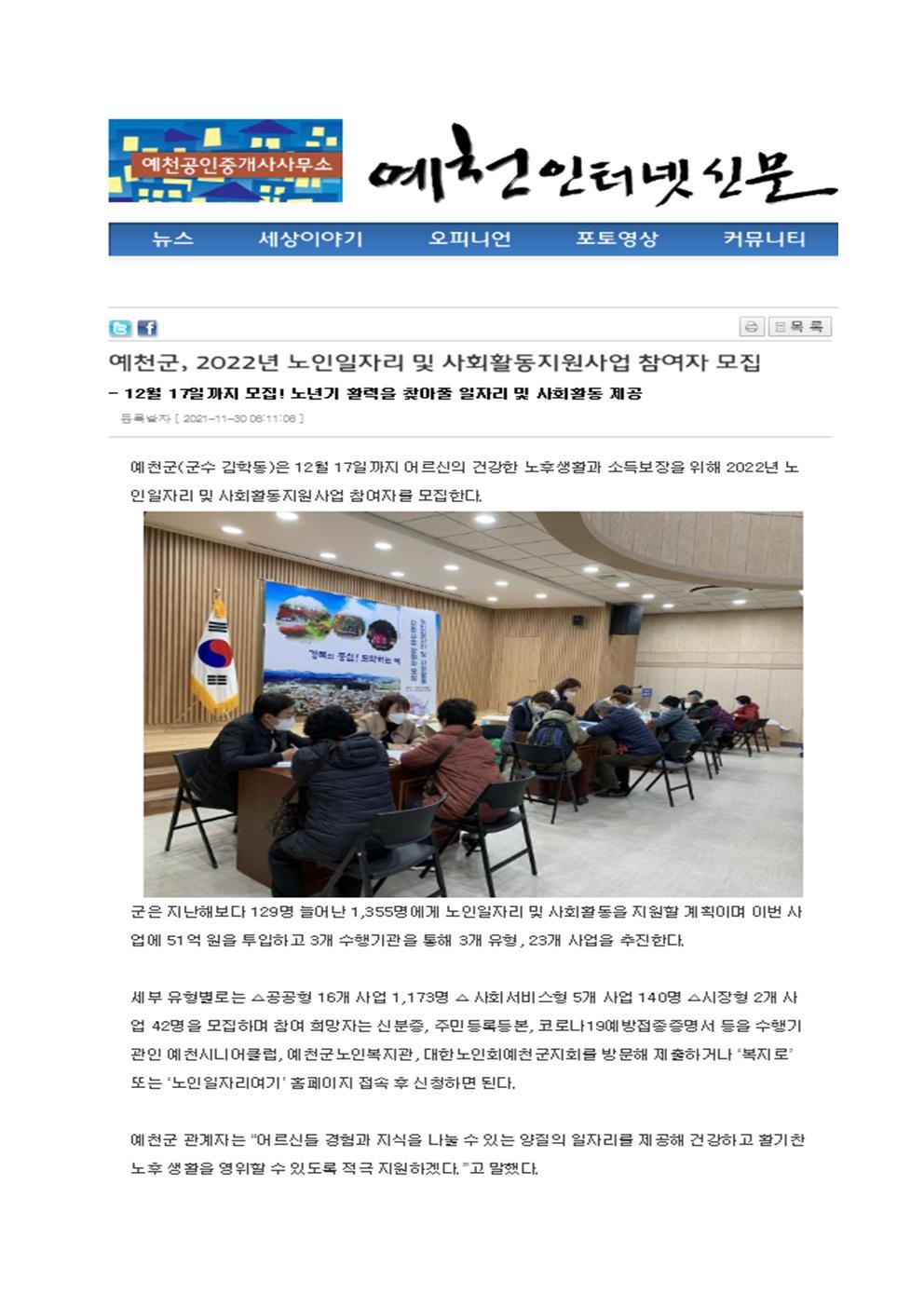2022년 노인일자리 및 사회활동 지원사업 참여자 모집에 따른 홍보기사 작성자예천시니어클럽|작성시간21.12.14|조회수283 목록 댓글 0 글자크기 작게가 글자크기 크게가 다음검색 현재 게시글 추가 기능 열기 북마크 공유하기 신고 센터로 신고 댓글 댓글 0 댓글쓰기 답글쓰기 댓글 리스트