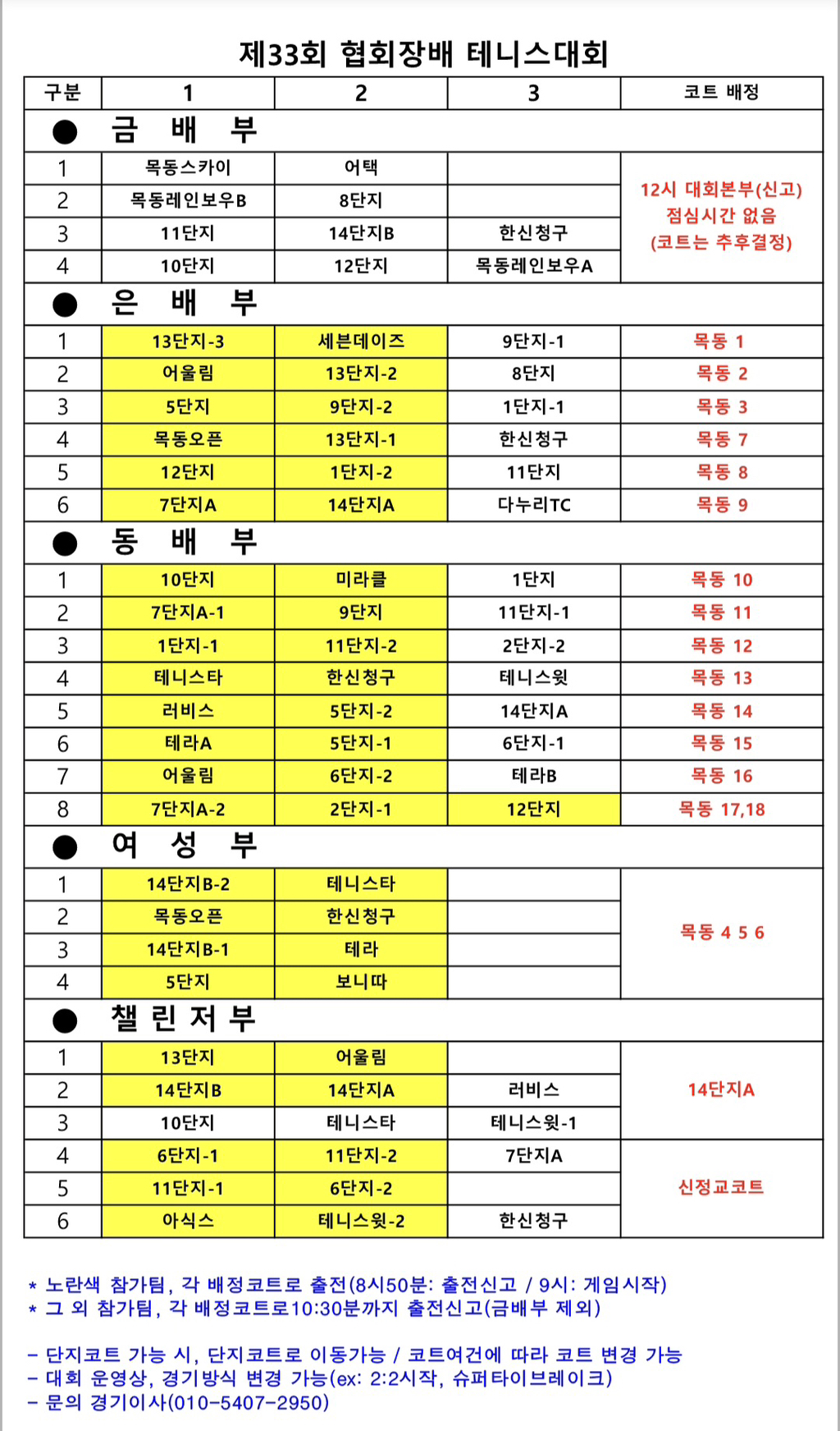 경기가 진행될 코트 정보를 안내드리오니 참고 부탁드리며 추가로 일기예보에 따라 내일 대회 운영에 일부 변경 사항이 있어 아래와 같이 안내드립니다.