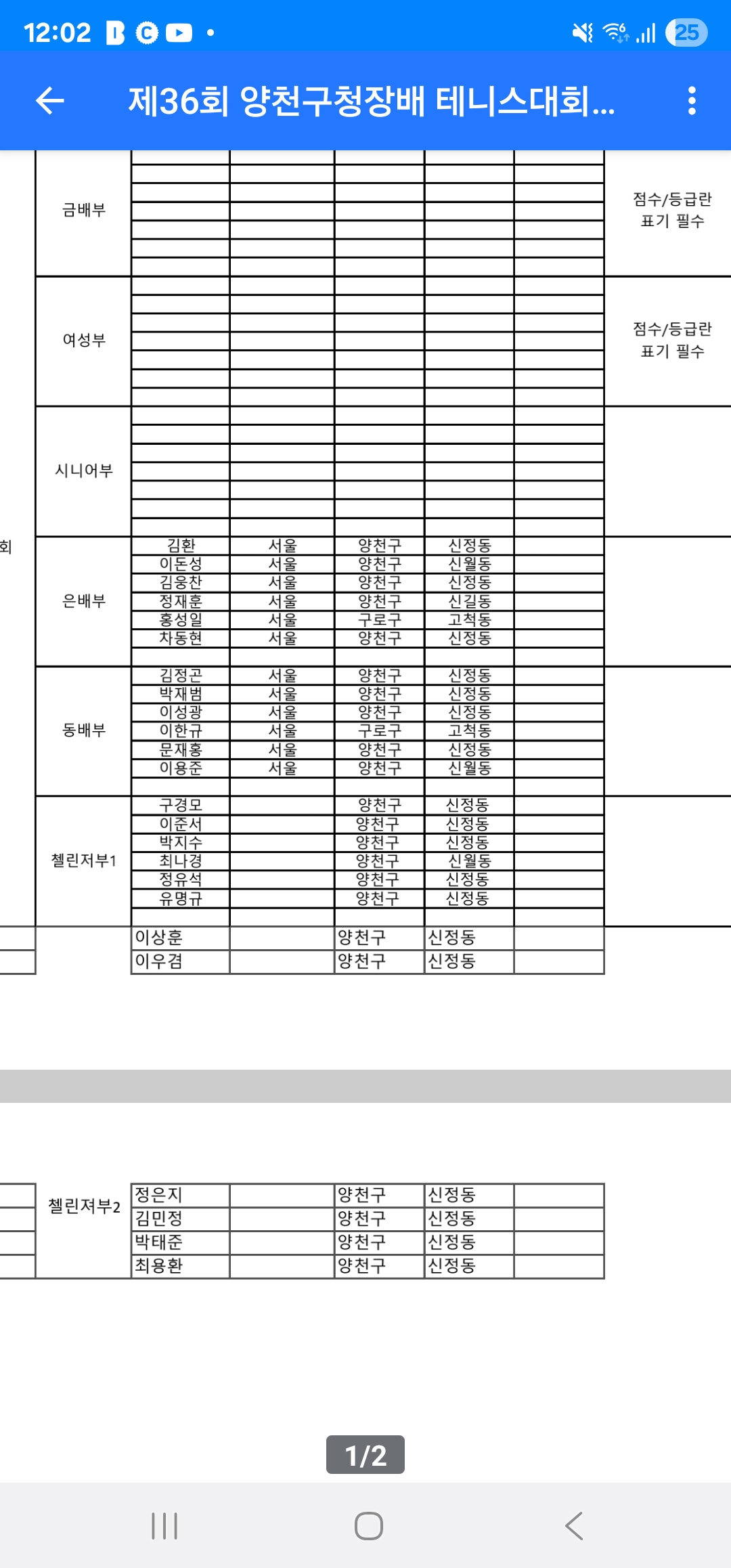 목동 11단지 참가합니다(수정) 작성자돼지|작성시간25.10.09|조회수67 목록 댓글 0 글자크기 작게가 글자크기 크게가 수고많으십니다.11단지 수정해서 참가신청서 올립니다.^^( 은배1 동배1 챌린저 2팀 )제36회 양천구청장배 테니스대회 참가신청서(11단지).xlsx14.47KB 첨부파일첨부된 파일이 2개 있습니다. xlsx 파일 제36회 양천구청장배 테니스대회 참가신청서(11단지).xlsx 다운로드 jpg 파일 사본-1000005789.jpg 다운로드 다음검색 현재 게시글 추가 기능 열기 북마크 공유하기 신고 센터로 신고 댓글 댓글 0 댓글쓰기 답글쓰기 댓글 리스트
