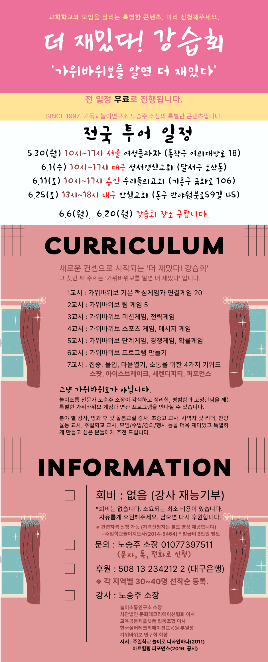 | Since 1997. 기독교놀이연구소의 "더 재밌다! 강습회" 가위바위보를 알면 더 재밌다! 전 일정 무료 교육으로 전환합니다. 교회와 주일학교를 살리고 치유하는 도구로 사용해주세요. * 새로운 컨셉으로 시작되는 '더 재밌다! 강습회' 그 첫번 째 주제는 '가위바위보를 알면 더 재밌다'입니다. 그냥 가위바위보가 아닙니다. 놀이소통 전문가 노 승주 소장이 각색하고 정리한, 평범함과 고정관념을 깨는 특별한 가위바위보 게임과 연관 프로그램을 만나실 수 있습니다. 방과 후 / 돌봄 교실 강사, 초중고 교사, 각 분야별 강사, 사역자 및 리더, 찬양율동 교사, 주일학교 교사 등 모임, 수업, 강의, 행사등을 더욱 재미있고 특별하게 만들고 싶은 분들에게 추천드립니다. ★ 장소 / 일시 : 정해지는 대로 계속 공지합니다. 교육 장소 요청드립니다. 2022년 5월 30일(월) am 10:00 ~ pm 5:00 서울 여성플라자 아트벌리지 5관 (서울 동작구 여의대방로54길 18) 2022년 6월 1일(수) am 10:00 ~ pm 5:00 대구 성서영신교회 (달서구 호산동) 2022년 6월 11일(토) am 10:00 ~ pm 5:00 용인 우리들의교회 (기흥구 금화로 106) 2022년 6월 25일(토) pm 1:00 ~ 6:00 대구 안심교회 (동구 반야월북로59길 45)) 2022년 6월 20일(월) am 10:00 ~ pm 5:00 미정 (추후 공지) ★ 내 용 : 1. 가위바위보 파트너 게임 - 변형. 노래. 패턴을 중심으로 풀어낸 20여가지 기본 핵심 게임과 연결 게임 2. 가위바위보 팀 게임 - 하나 씩 또는 묶어서 진행하는 5가지 팀 게임 3. 가위바위보 전체 게임 - 색종이(카드)와 미션으로 풀어 낸 연결 게임 4. 가위바위보 전략 게임 - 전략 가위바위보 (거점 확보. 목표 달성. 점수 대결) 5. 가위바위보 운동 게임 - 야구. 미식축구, 달리기를 응용한 운동 게임 6. 가위바위보 응용 게임 - 빙고. 명함을 도구로 디자인 한 메시지 응용 게임 7. 가위바위보 단계별 게임 - 단계별로 디자인 한 최고의 액션 게임 8. 가위바위보를 빛나게 하는 연관 게임 - 경쟁게임, 확률게임 9. 가위바위보 (정기)프로그램 만들기 (10분.30분.60분 / 1주. 1달. 분기. 연중) 10. 집중.몰입.마음열기.소통을 위한 4가지 키워드 (스팟.아이스브레이크.세렌디피티.퍼포먼스) ★ 강사 : 노 승주 소장 놀이소통연구소 소장 사단법인 문화레크리에이션협회 이사 협동조합 교육공동체플랫폼 이사 아트힐링 퍼포먼스협회 부 회장 주일학교 커뮤니티 대표 가위바위보 놀이연구회 회장 한국실버레크리에이션교육원 부원장 저서 - 주일학교 놀이로 디자인하다 (2011/2015 대만출판), 아트힐링 퍼포먼스 (2016. 공저) 방송 - CGN TV 'TV 빛과 소금, 극동방송 '하나되게 하소서' 외 ★ 회비 : 없음 (강사 재능기부) * 회비는 없습니다. 최소한의 소요 경비가 있습니다. 자유롭게 후원해주세요. 남으면 다시 후원합니다. * 관련 자격 신청 가능(자격 신청자는 별도 영상 제공합니다) - 주일학교 놀이지도사(2014-5464) / 자격 발급비 6만원 별도 ★ 문의 및 등록 : 010-7739-7511 (노 승주 소장) ★ 후원 : 508-13-234212-2 (대구은행 노승주) ★ 강습회 장소가 필요합니다. 도움을 주실 분들은 연락주세요. 일정은 협의합니다. 기독교놀이연구소 http://www.play.or.kr |
