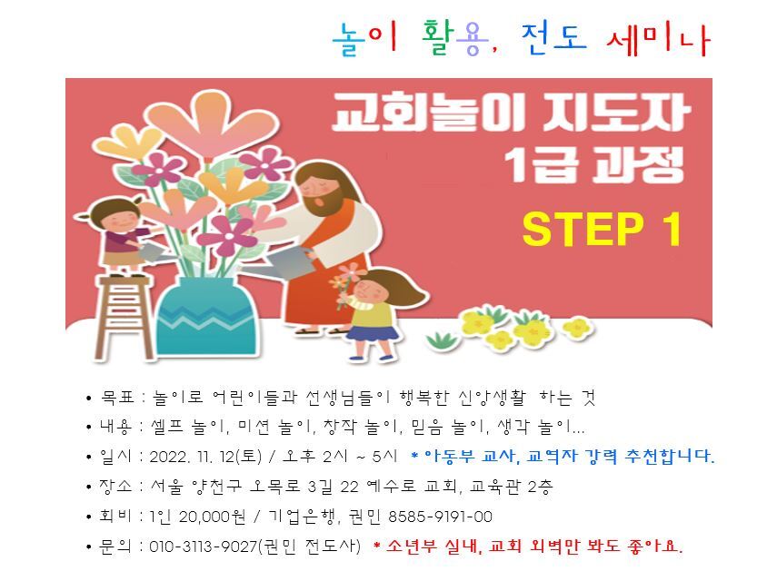 놀이와 부흥 작성자고요소리|작성시간22.11.08|조회수10 목록 댓글 0 글자크기 작게가 글자크기 크게가 아동부 사역 21년 전도사입니다. ^^뒤늦은 신앙생활로 전도에 열정있어요. 현재 놀이 활용이 가장 좋다고 판단됩니다. 다음검색 현재 게시글 추가 기능 열기 북마크 공유하기 신고 센터로 신고 댓글 댓글 0 댓글쓰기 답글쓰기 댓글 리스트