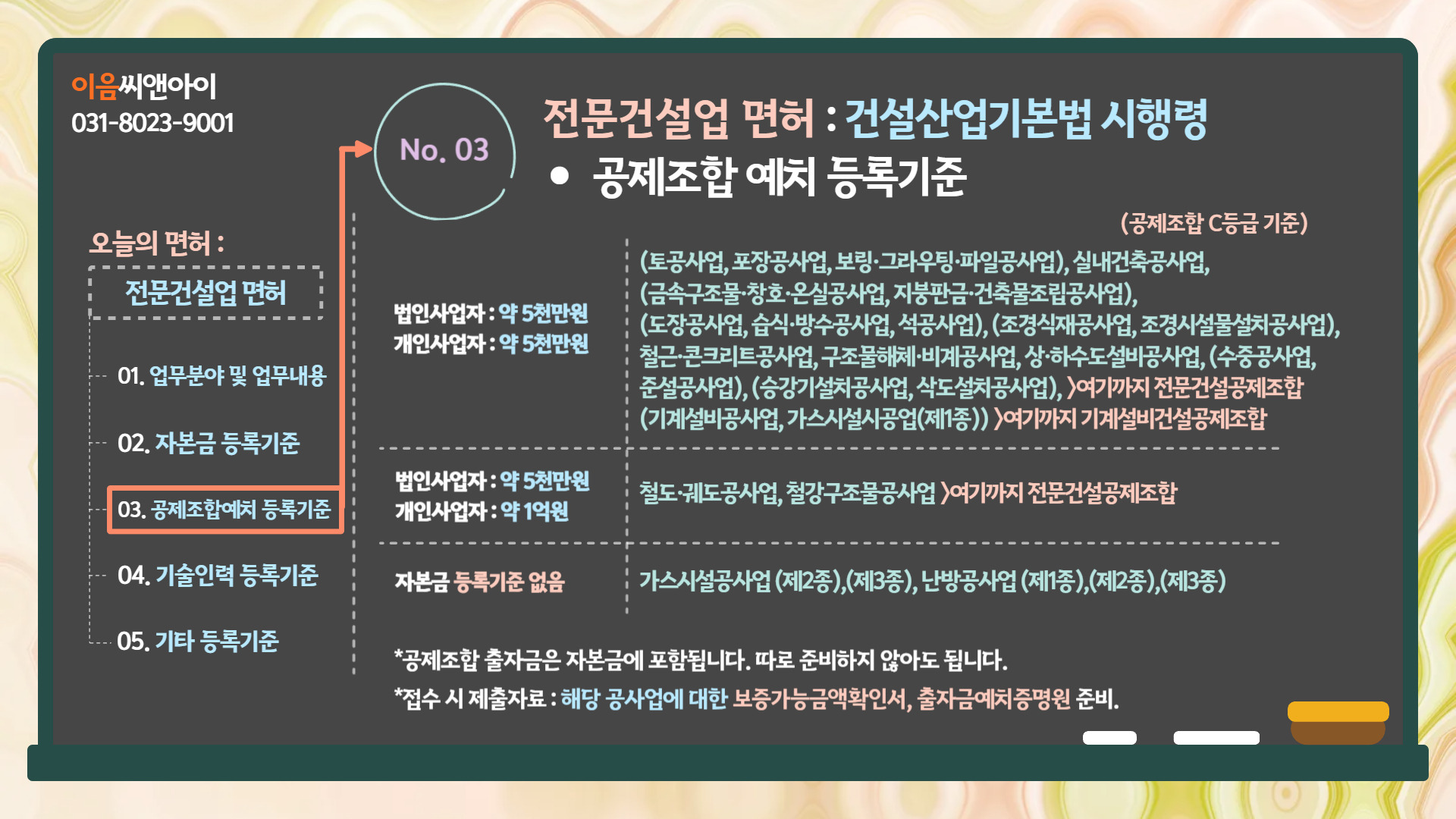 3. 전문건설업면허 : 건설산업기본법 시행령 - 공제조합 예치 등록기준.